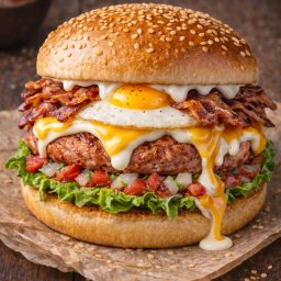 Pão de hambúrguer com gergelim, mussarela, ovo, bacon e maionese caseira.