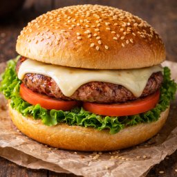 Pão de hambúrguer, hambúrguer artesanal, mussarela, tomate e maionese caseira.