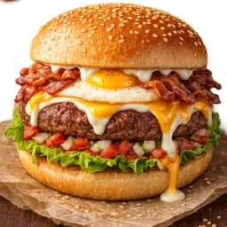 Pão de hambúrguer, hambúrguer artesanal, mussarela, presunto, bacon, ovo, catupiry, cheddar, alface,...