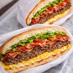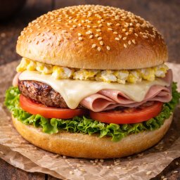 Pão de hambúrguer com gergelim, queijo mussarela duplo, presunto duplo, bacon, ovo, alface, tomate e...
