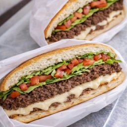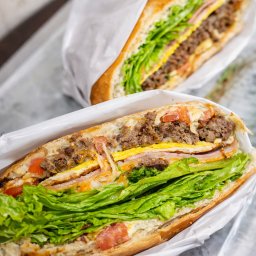 Pão de hambúrguer com gergelim, hambúrguer de linguiça, mussarela, alface, tomate e maionese caseira...