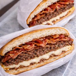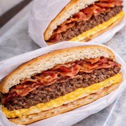 Pão de hambúrguer com gergelim, mussarela, bacon, cheddar e maionese caseira.