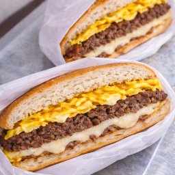 Pão de brioche, dois hambúrgueres, queijo empanado, cebola onion, queijo mussarela duplo, cheddar, b...