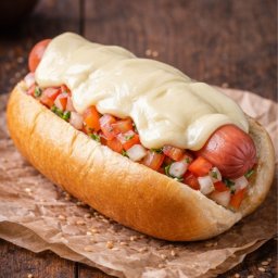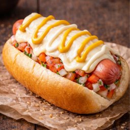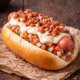 Salsicha, mussarela, bacon, vinagrete, molho e maionese caseira.