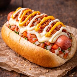 Salsicha, mussarela, bacon, catupiry, cheddar, vinagrete, molho e maionese caseira.
