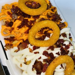 Batata Frita, bacon, cheddar, catupiry e 3 cebola onion