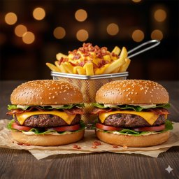 2 Lanches + Batata P: 1 Face Tudo + 1 Face Picanha Tudo + 1 Porção de Batata Frita Pequena com Bacon...