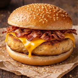 Pão de hambúrguer com gergelim, hambúrguer de frango, mussarela, bacon, cheddar e maionese caseira.