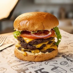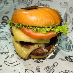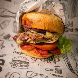 Pão, 2 hambúrgueres 150g, mussarela ou cheddar, 2 fatias de bacon crocante, alface, tomate e molho e...