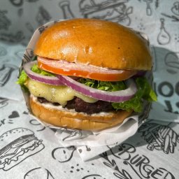 Pão, 1 hambúrguer, calabresa, cheddar ou mussarela , alface, tomate e cebola roxa.