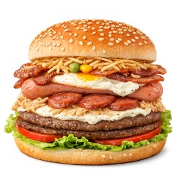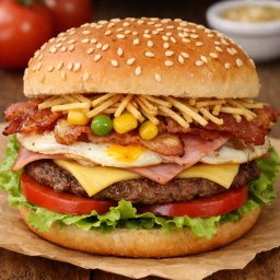 2 Carne de hambúrguer bovina,queijo mussarela,calabresa,salsicha,presunto,ovo,bacon,alface,tomate,mi...