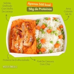 Saboroso salmão grelhado com molho de laranja, acompanhado de purê de cenoura com chia e arroz color...