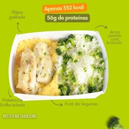 Tilápia grelhada com arroz e brócolis, acompanhada de purê de mandioquinha. Ingredientes: · Arroz ja...