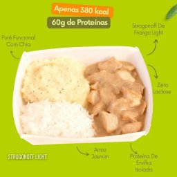 Um strogonoff de frango leve e delicioso, servido com arroz jasmim e purê funcional. Ingredientes: F...
