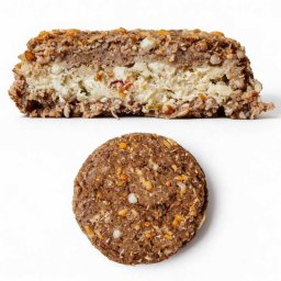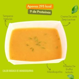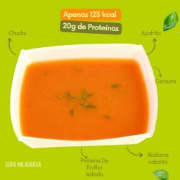Elaborada com abóbora cabotiá, cenoura, chuchu, açafrão, proteína isolada de ervilha, salsa, orégano...
