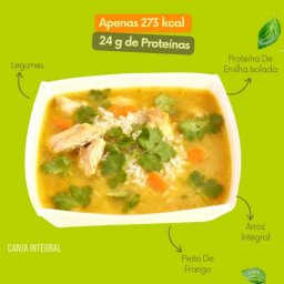 Canja preparada com peito de frango, batata-doce, cenoura, arroz integral e temperos frescos, fornec...