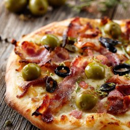 Mussarela, bacon, tomate, azeitona e catupiry