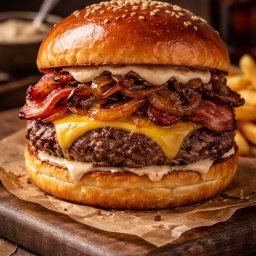 Pão, 2 hambúrguer 150g, bacon, cheddar, cebola caramelizada e molho especial