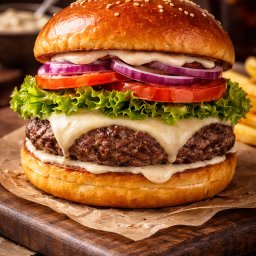 Pão, hambúrguer 150g, mussarela, alface, tomate, cebola roxa e molho especial