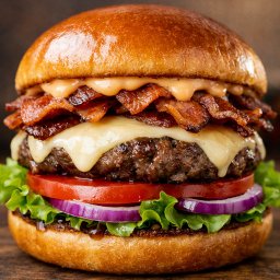 Pão, hambúrguer 150g, mussarela, bacon, alface, tomate, cebola roxa e molho especial