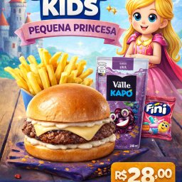 Contém: 1 pão brioche, hambúrguer de 80g, maionese e mussarela, 1 suco kapo, 1 bala fini beijos e ba...