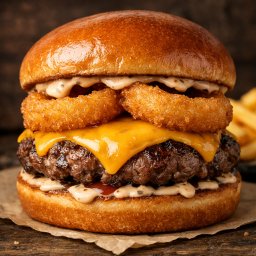 Pão brioche, hambúrguer 150g, molho especial, cheddar e aneis de cebola crocante