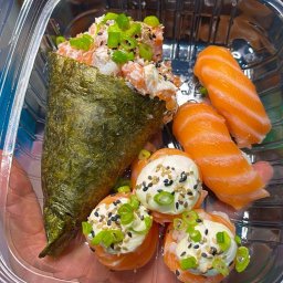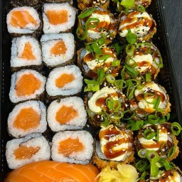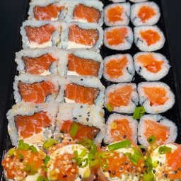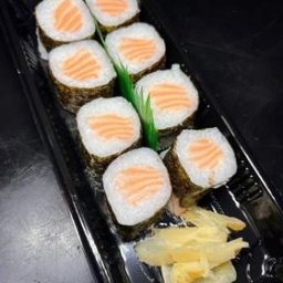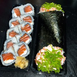02 Temakis Salmão cru e 10 uramakis de salmão com cream cheese, acompanha Gengibre e molhos.