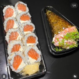 01 temaki (cru ou grelhado) + Hot roll de salmão 12 unidades. Acompanha molho shoyu, molho tarê e ha...