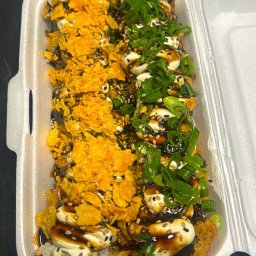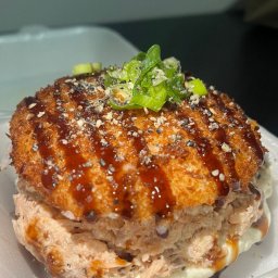 Sushi burguer de salmão cru em cubos (Base é feita de arroz empanado e frito, e o recheio de salmão ...