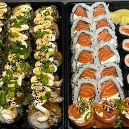 Combo YUMI 10 uramaki de salmão 10 hot roll de salmão 02 niguiri salmão acompanha molhos e hashi