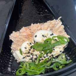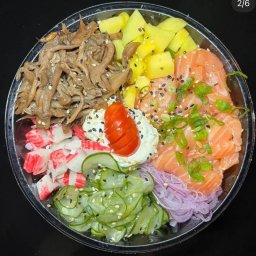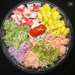 POKE 500G SALMÃO CRU EM CUBOS , SHIMEJI , MANGA KANI KAMA SUNOMONO CEBOLA ROXA CREAM CHESSE