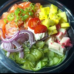 POKE 500G SALMÃO CRU EM CUBOS MANGA KANI KAMA SUNOMONO CEBOLA ROXA CREAM CHESSE