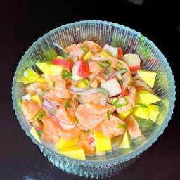 Ceviche de Salmão, cebola roxa, cebolinha, kani, manga e molho especial do chef. 400g