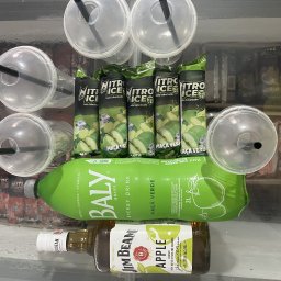 •Whisky Jim Beam Maçã Verde 1L •Baly Energy Drink 2L •Gelos Saborizados (x5) OU Gelos Cubo (x2) •Kit Copos Bolha, canudos