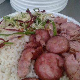 Linguiça Toscana Acebolada, arroz, feijão, farofa e salada, tempero caseiro 😋