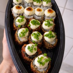 Delicioso combo de sushi com peças variadas, incluindo hot rolls crocantes e sushis especiais cobert...